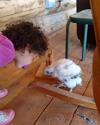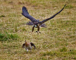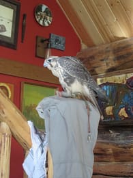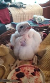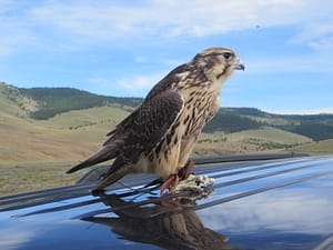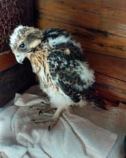 With the help of a friend, I took Lola from her eyrie – a small cave in the side of a cliff – on May 31st when she was approximately 17 days old. She was huddled together with 1 sister, 2 brothers, and 1 egg that failed to hatch. This is the average size for a prairie falcon eyrie.