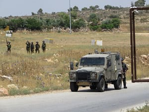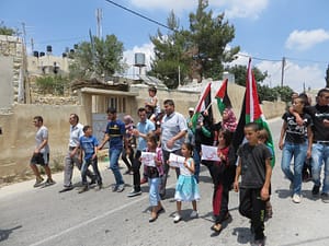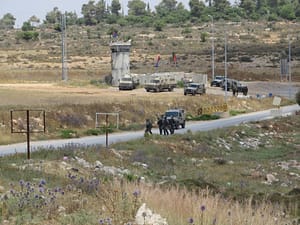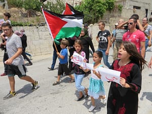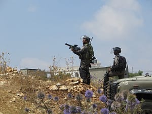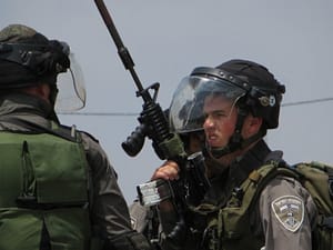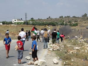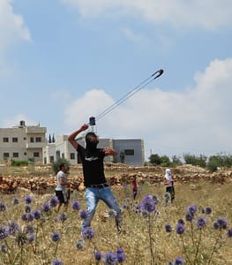 armaments were flags and banners, though a few teenage boys eventually pulled out their sling-shots and began throwing rocks after the Israeli soldiers arrived and began pelting us with tear gas.