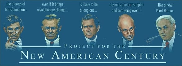 very rich and powerful as a result of that cold war defense spending, and it wasn’t long before they started circulating the idea of using America’s newly uncontested might for a very expensive campaign to hammer down a liberal world order led by the beneficent guidance of the United States government. Soon the neoconservatives were pushing their