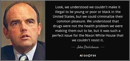 “The Nixon campaign in 1968, and the Nixon White House after that, had two enemies: the antiwar left and Black people. You understand what I’m saying? We knew we couldn’t make it illegal to be either against the war or Black, but by getting the public to associate the hippies with marijuana and Blacks with heroin, and then criminalizing both heavily, we could disrupt those communities. We could arrest their leaders, raid their homes, break up their meetings, and vilify them night after night on the evening news. Did we know we were lying about the drugs? Of course we did.”