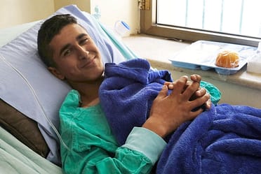 The Palestinian teenager was handcuffed and blind-folded, thrown to the ground. When he tried to stand a soldier shot him and hit a major artery in his right leg.